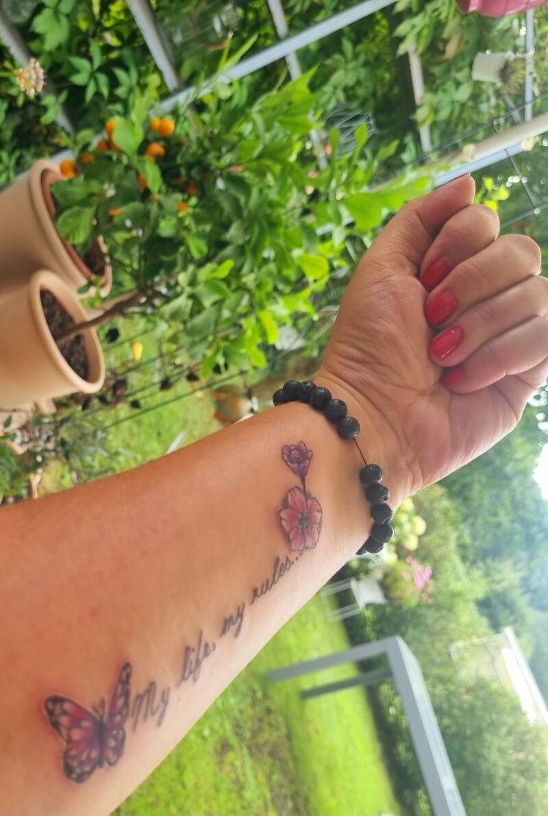 Deshalb... zurück zum Tattoo 🙂 Die Idee dazu kam mir vor ein paar Monaten, als ich hier in meinem Garten saß und einen Schmetterling beobachtet habe. Schmetterlinge finde ich sowieso toll und irgendwie mögen die mich auch. Der Spruch war schon länger da und plötzlich war es beschlossen. Ich mochte die Idee, dass mein Garten sich symbolisch auf meinem Körper wiederfindet. Und da das eine echte und wahre Liebe zwischen uns ist, besteht auch nicht die Gefahr, dass wir uns trennen und ich mich irgendwann darüber ärgere (Leute, ich würde mir niemals einen Namen tätowieren lassen - das hätte schon mehrmals richtig schief gehen können...😁).