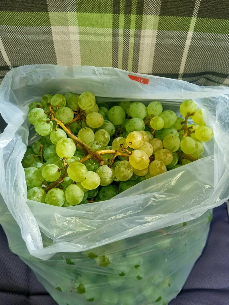 Nachdem ich meine Ernte sortiert und bewundert hatte, rief jemand meinen Namen. Meine liebe Nachbarin, die immer sehr darauf bedacht ist, mich nicht verhungern zu lassen...in der Hand hielt sie eine Tüte mit mindestens 2 Kilo Trauben - für mich, weil meine ja nicht schmecken 🤣 Recht hat sie leider...und an der Stelle möchte ich mal erwähnen, dass ich viele nette und sehr hilfsbereite Nachbarn habe.