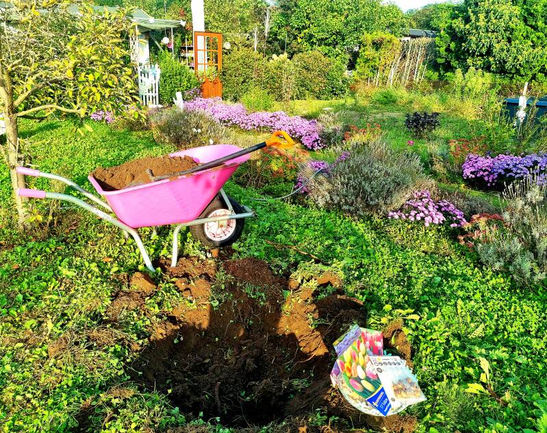 Nachdem mein Besuch sich nachmittags dann verabschiedet hatte, habe ich mich an meine neuen Blumenzwiebeln erinnert. Und festgestellt, dass es noch hell ist. Und es vielleicht nicht schaden könnte, die ein oder andere Kalorie wieder loszuwerden. Also habe ich mich mit Spaten und rosa Schubkarre ans Werk gemacht. Und mitten ins Unkraut (das mal Rasen war) ein Loch gebuddelt, 85 Blumenzwiebeln rein gesteckt und wieder zugeschaufelt. Das Stück muss ich auf jeden Fall schonmal nicht mehr vertikutieren 😉 Und ich rate den Wühlern ganz dringend, meine Zwiebeln in Ruhe zu lassen. So.