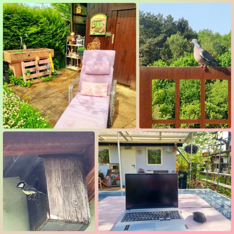 Wo ich schonmal aufgestanden war, habe ich auch gleich noch ein bisschen Unkraut gerupft, die Vogeltränke sauber gemacht, ein paar Tassen gespült und im Haus aufgeräumt. Dann ging's wieder auf die Liege. Von der aus ich meine beiden bewohnten Nistkästen beobachten kann. Und die fleißigen Vogeleltern, die unermüdlich hin und her geflattert sind. Was ich total toll finde und wirklich rührend. Und weshalb ich mir für nächstes Jahr eine Kamera für den Nistkasten besorgen werde.