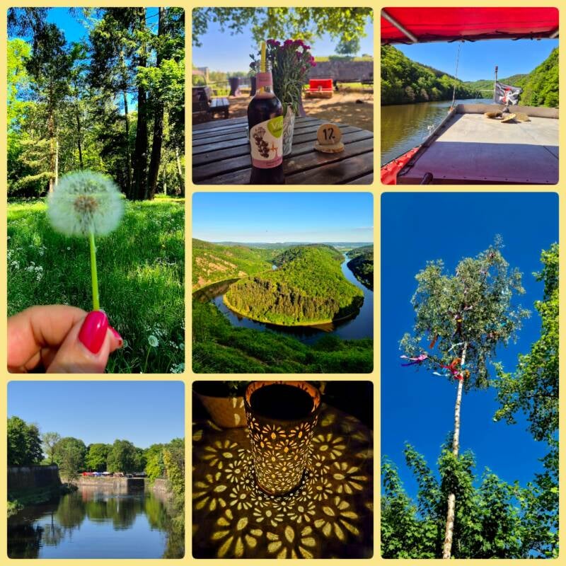 Nach der erfrischenden Pause gab es dann noch einen leckeren Cappuccino in der Stadt, einen Zwischenstopp im Garten und... eine Autofahrt nach Mettlach, wo wir ein Eis verspeisten, während wir auf das Highlight des Tages warteten... unsere Schifffahrt auf der Saar... entlang der grünen Ufer und mitten durch die Schleuse bis zur Saarschleife und wieder zurück. Anderthalb Stunden Fahrt auf dem Wasser, schöne Aussichten, jede Menge Spaß, einige Selfies und keine Getränke (die haben es nämlich vorgezogen, den Schiffsboden zu dekorieren)... das war unsere "Ausbeute".