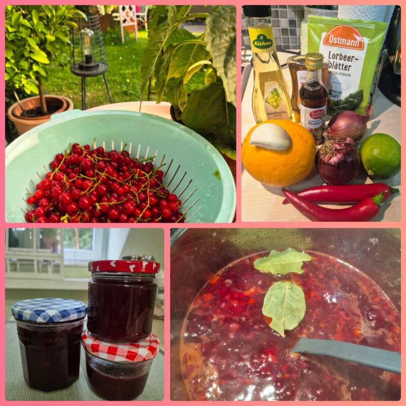 Und darüber hinaus hat Kochen ja ziemlich viel mit Garten zu tun. Denn wenn man im Garten leckeres Obst und Gemüse erntet, kann man daraus leckere Sachen kochen 🥰 Ich habe nach Gurken und Erdbeeren in den letzten Tagen Johannisbeeren geerntet. Und zwar ziemlich genau 800 Gramm, die es zu verarbeiten galt. Und weil ich es lieber scharf, als süß mag... habe ich entschieden, ein Chutney zu kochen. Und den Plan gestern gleich in die Tat umgesetzt. Was am Ende vielleicht etwas aufwändiger war, als ursprünglich gedacht - und weniger Ertrag gebracht hat, als erhofft 🤣