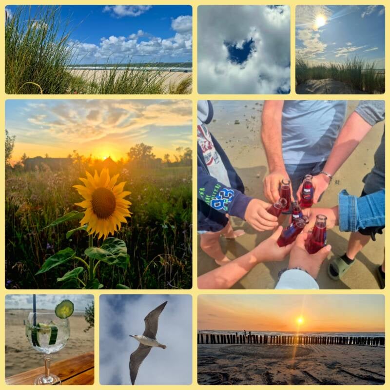 Darauf folgte eine wunderschöne Zeit mit einem ausgiebigen Bad im Meer, ganz viel Zeit zum Reden, Genießen, Durchatmen... auf der Luftmatratze in den Dünen... mit einem Gurkenwasser in der Strandbar... Muscheln sammeln, Spuren in den Sand malen, ganz viel lachen, Musik hören... Erinnerungen sammeln... Pfannkuchen zum Frühstück, meine erste Pizza am Strand futtern (was ihr definitiv unbedingt mal probieren solltet 🥰)... ein spontanes Sonnenblumen-Shooting auf dem Weg zum Supermarkt (was nicht nur sehr sinnvoll, sondern auch sehr erheiternd für meinen Beifahrer und mich war - das Parken auf dem Radweg war weniger sinnvoll, aber nötig)... ein spektakulärer Sonnenuntergang am Meer nach einem kompletten Tag am Strand... Schuhe voller Schlamm und Betten voller Sand... eine Kuh, die mich offensichtlich sehr anziehend fand (und zum Glück eingezäunt war)... Kibbeling im Regen...